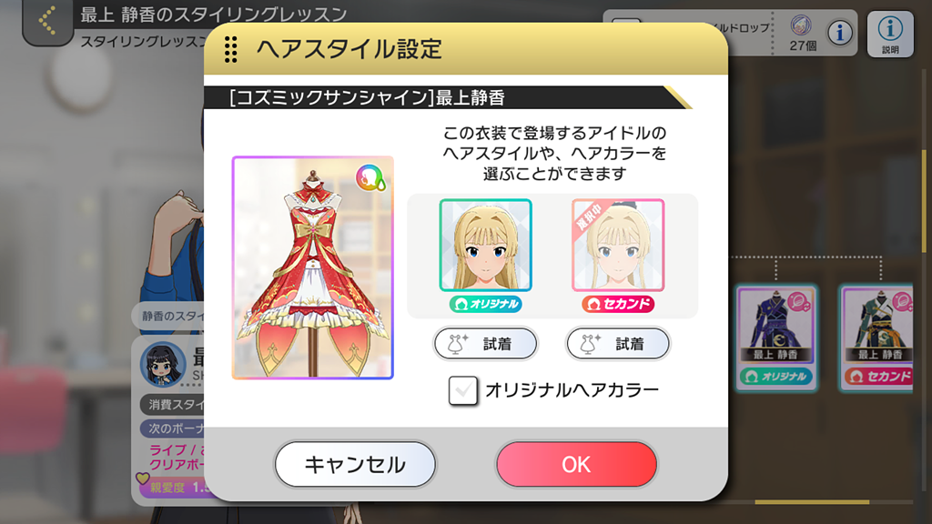 다시 시즈카로 돌아와서, 물방울 아이템을 이용해 세컨드 헤어스타일을 열였습니다.